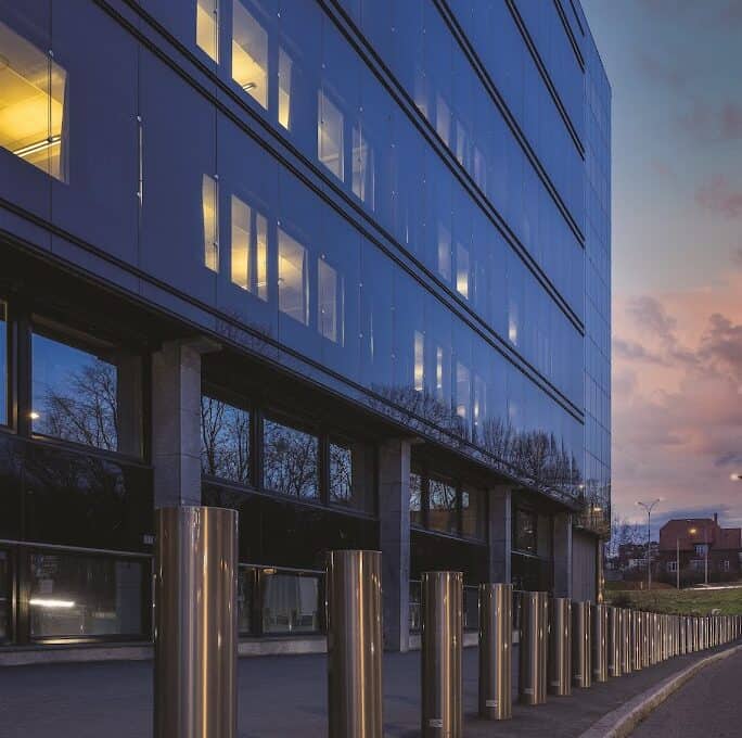 - Fasaden på bygningen er en kritisk barriere mot eksterne trusler. Vi kan bistå med alt fra sikkerhetsglass og -folie til dører og sluser, som gir ekstra beskyttelse mot innbrudd, skudd og eksplosjoner.